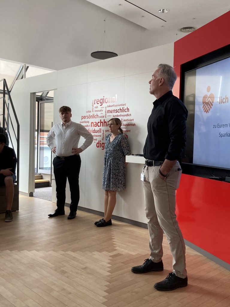 Nach dem Besuch des Amtsgerichts begaben sich die Schüler zur örtlichen Sparkasse. Dort erwarteten sie Sandwiches und Getränke, die von der Sparkasse großzügig zur Verfügung gestellt wurden. Anschließend wurden die Schüler durch das Digitallabor, den Selbstbedienungsbereich und das Depot geführt, wo sie interessante Einblicke in die Arbeit einer Bank erhielten. Die 9 C erkundete erst die Sparkasse und verfolgte sodann noch eine Strafrechtsverhandlung im Gericht.