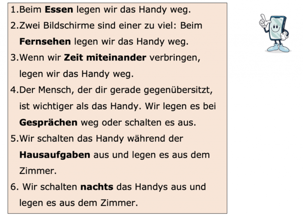 Im Vertrag vereinbaren die Schülerinnen und Schüler, sich an die gemeinsam aufgestellten Handyregeln zu halten und das Handy nachts ausgeschaltet aus dem Schlafzimmer zu legen.