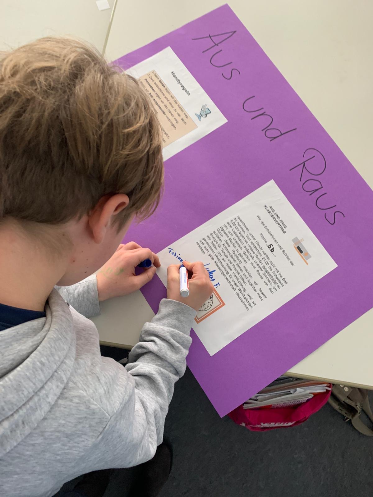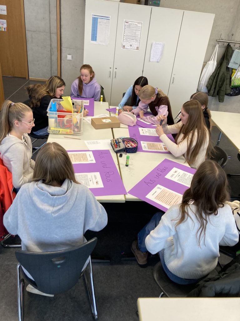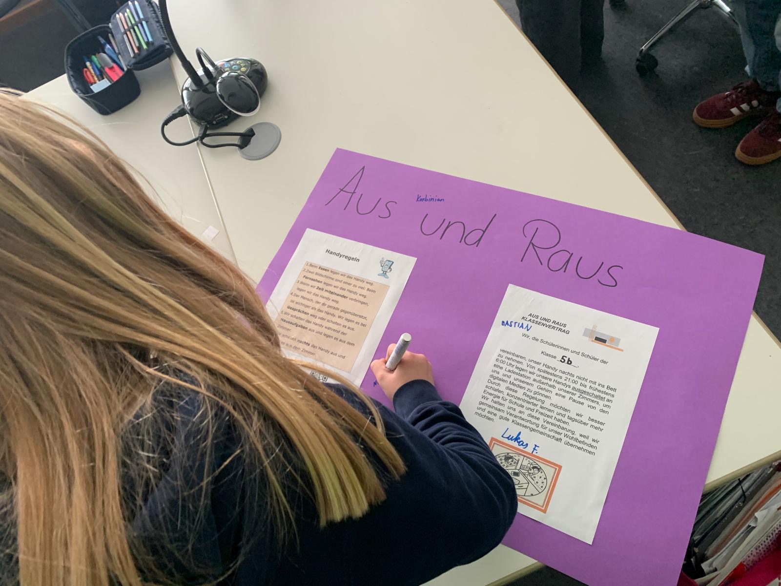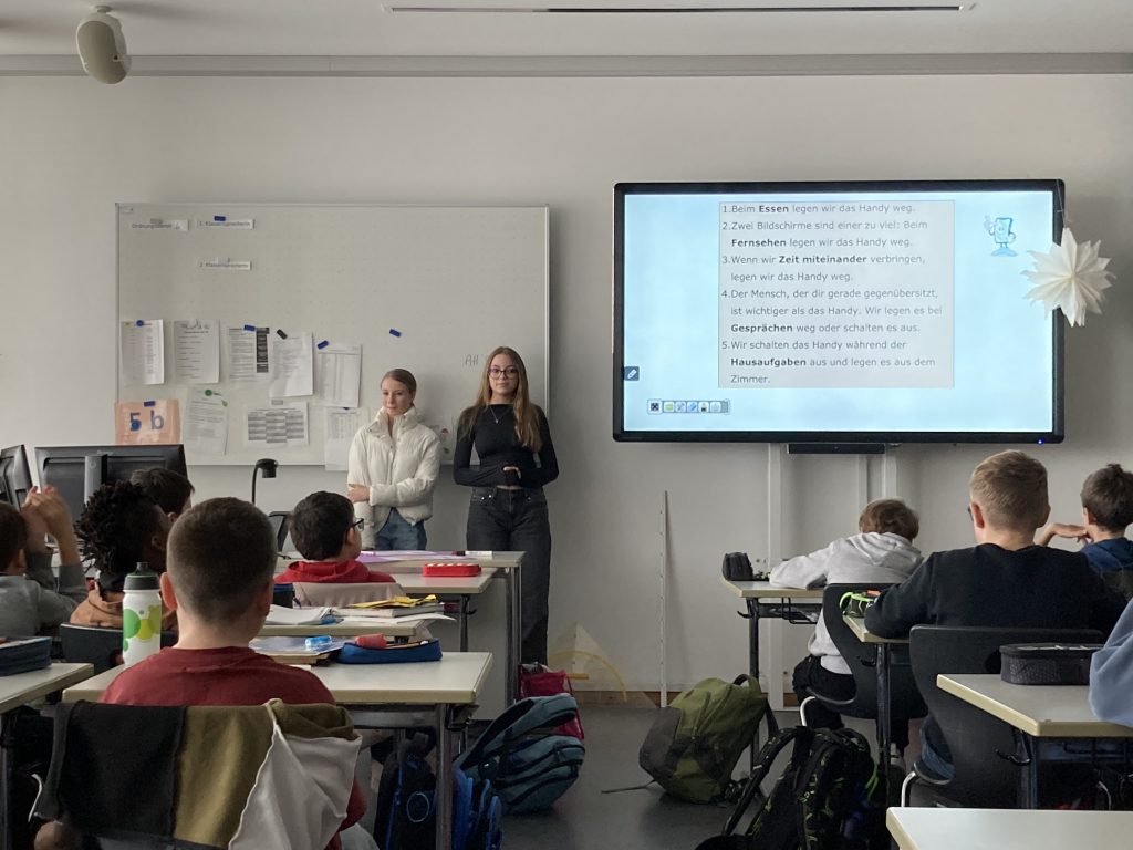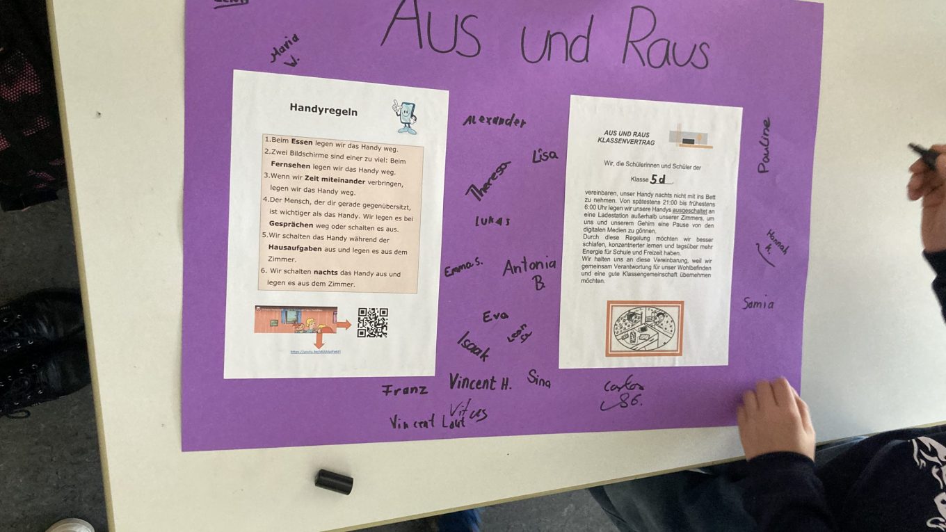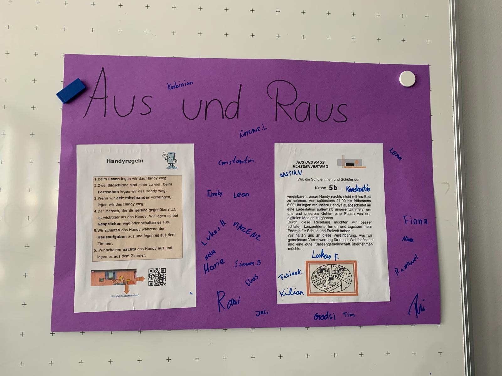 Am Mittwoch vor den Weihnachtsferien besuchten 10 Schülerinnen der Klassen 8B und 8E jeweils im Team unsere fünf 5. Klassen, um gemeinsam mit den Schülerinnen und Schülern grundlegende Handyregeln zu erarbeiten. Ziel war der Abschluss eines Vertrags, der unter dem Motto „Aus und Raus“ steht.
