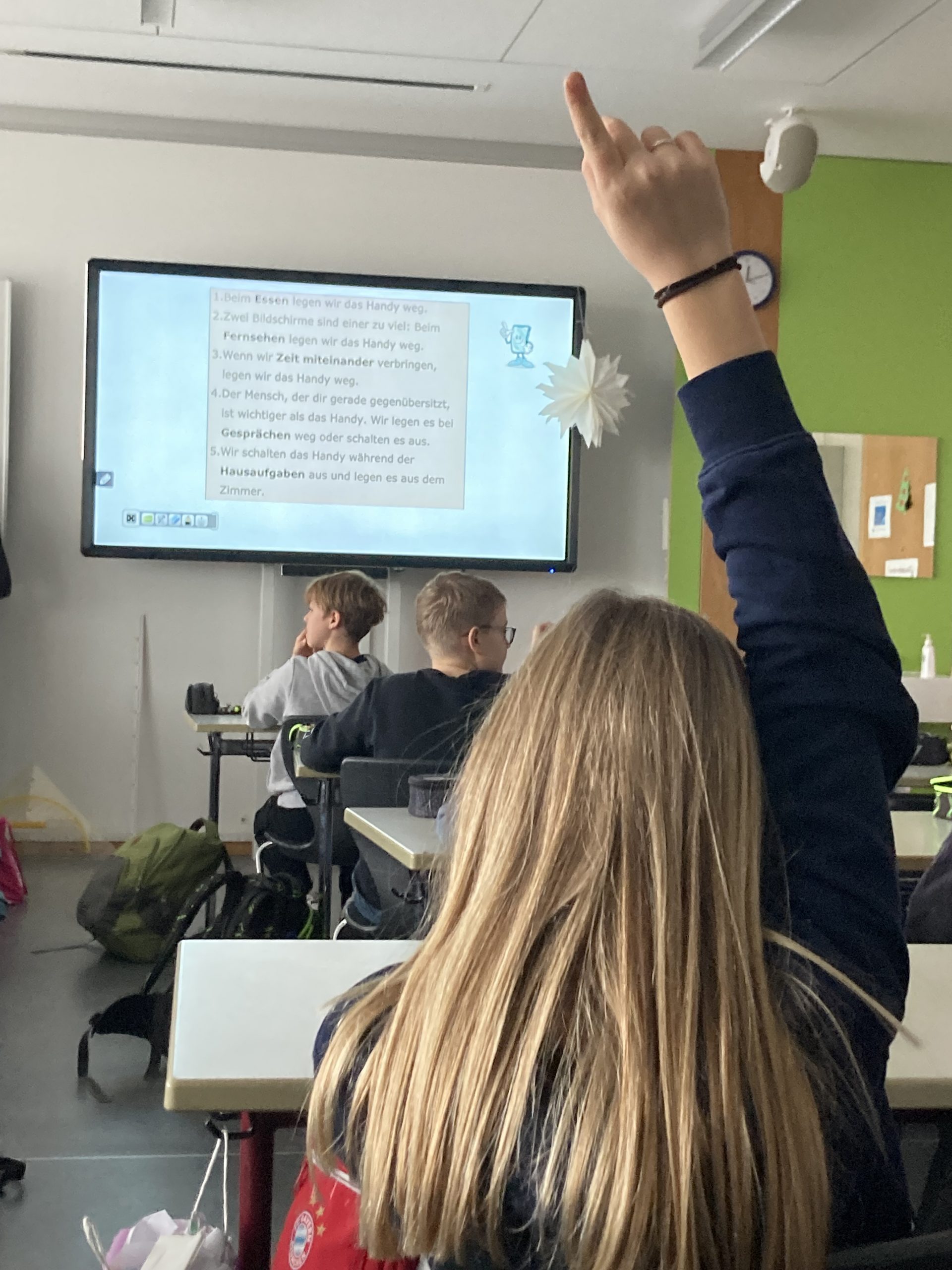 In den Klassen war eine positive Grundeinstellung zu spüren. Viele Schülerinnen und Schüler nannten Beispiele aus ihrem Alltag, in denen sie sich von ihrem Handy gestört fühlen. Eine Schülerin berichtete etwa, dass sie bewusst ihr Handy manchmal abschaltet, um Ruhe zu haben, und nach nur zwei Stunden Ruhezeit bereits 140 WhatsApp-Nachrichten erhält und sich dadurch oft überfordert fühlt.