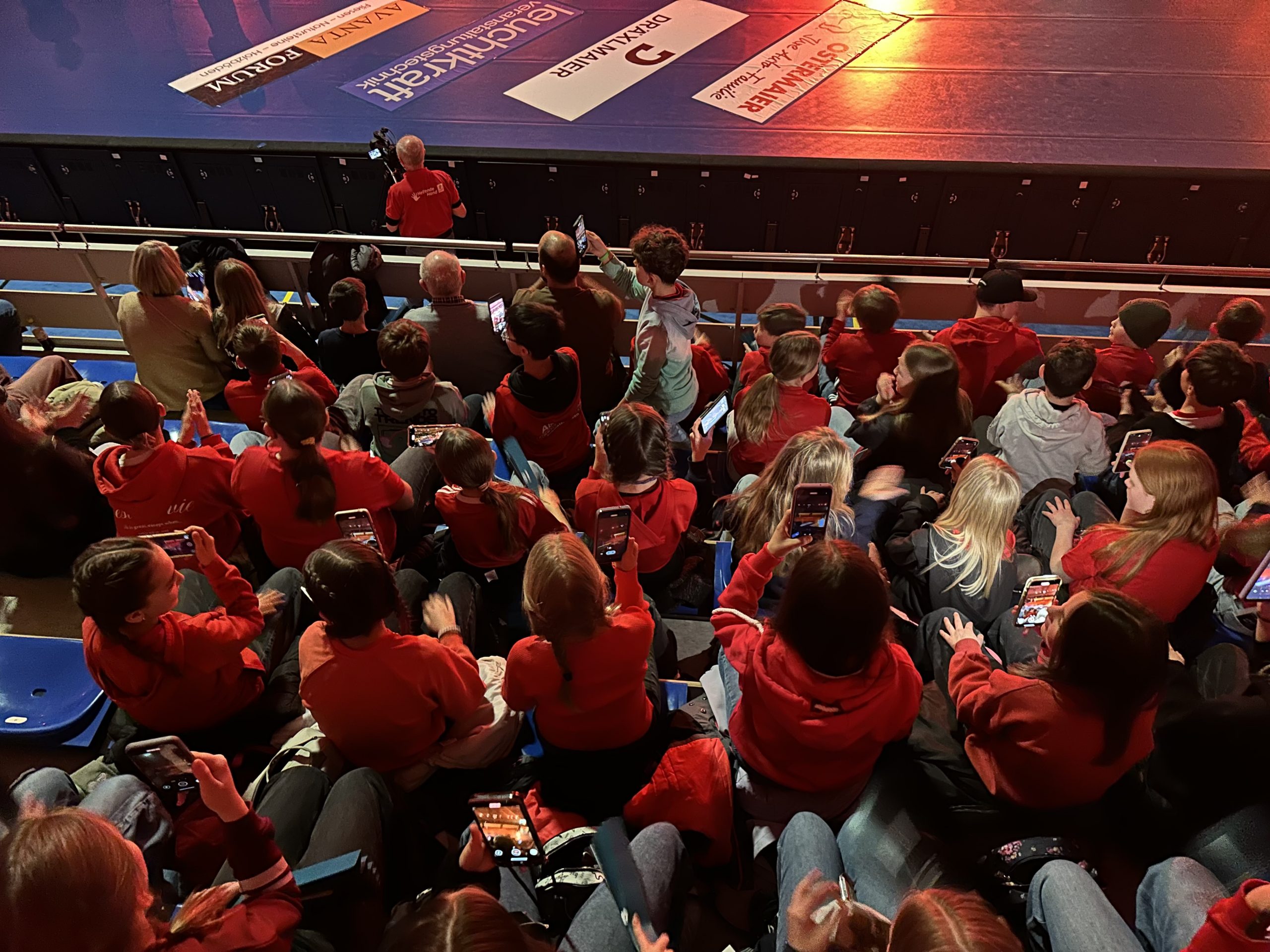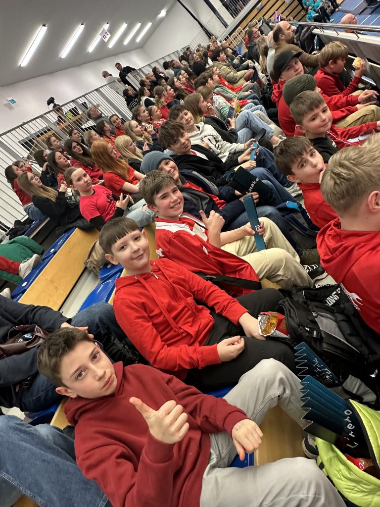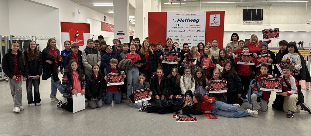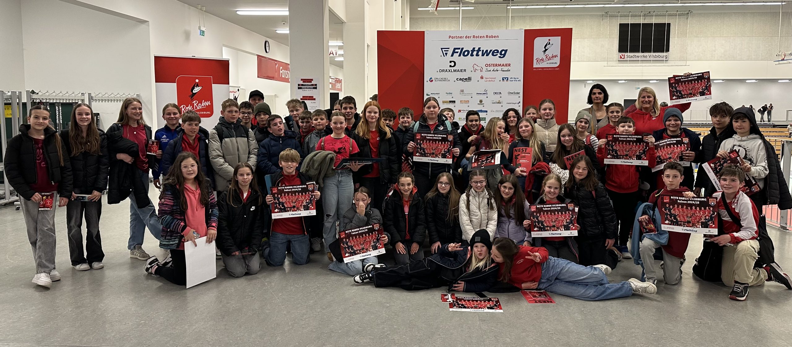 Schon während der Fahrt herrschte eine gute Stimmung an Bord, die das Lied Wackelkontakt beim Erreichen der Ballsporthalle weiter anheizte. Alle freuten sich auf das bevorstehende Spiel. Viele Schülerinnen und Schüler trugen rote T-Shirts, die das Teamgefühl stärkten und sie als große Fangemeinde der Roten Raben Vilsbiburg erkennbar machten. So wurde die Gruppe aus Rottenburg unter tosendem Applaus extra in der Halle begrüßt und der anwesende Ehrengast, der MB von Niederbayern, Herr Manfred Brodschelm, freute sich mit den Klassen und wechselte für den zweiten Satz spontan seinen Platz zu der begeisterten Schulgruppe in Block B2.