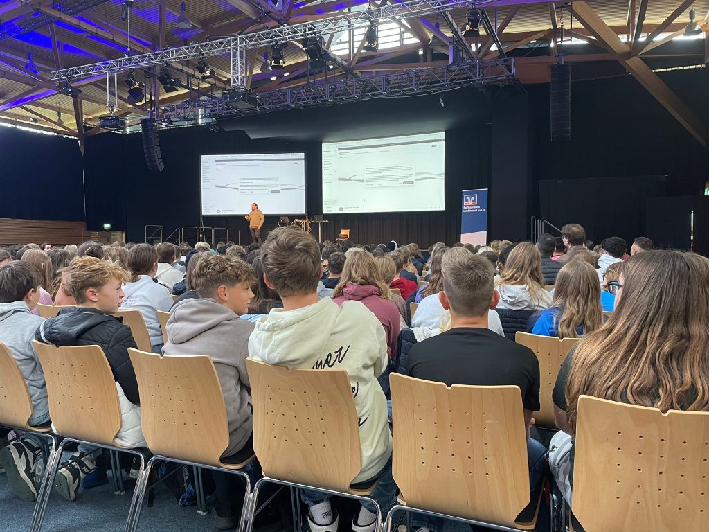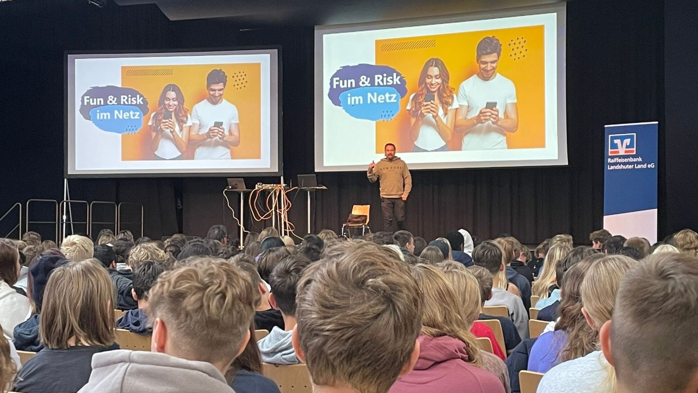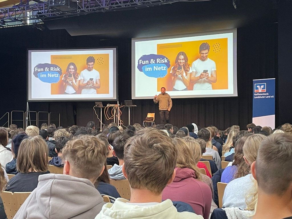 Am Dienstag, den 1. Oktober, machten sich unsere Siebtklässler – zusammen mit ihren Lehrkräften – auf den Weg in die Eskarahalle in Essenbach, um dort der Einladung der Raiffeisenbank Landshuter Land nachzukommen und den Vortag „Fun and Risk“ zu besuchen.