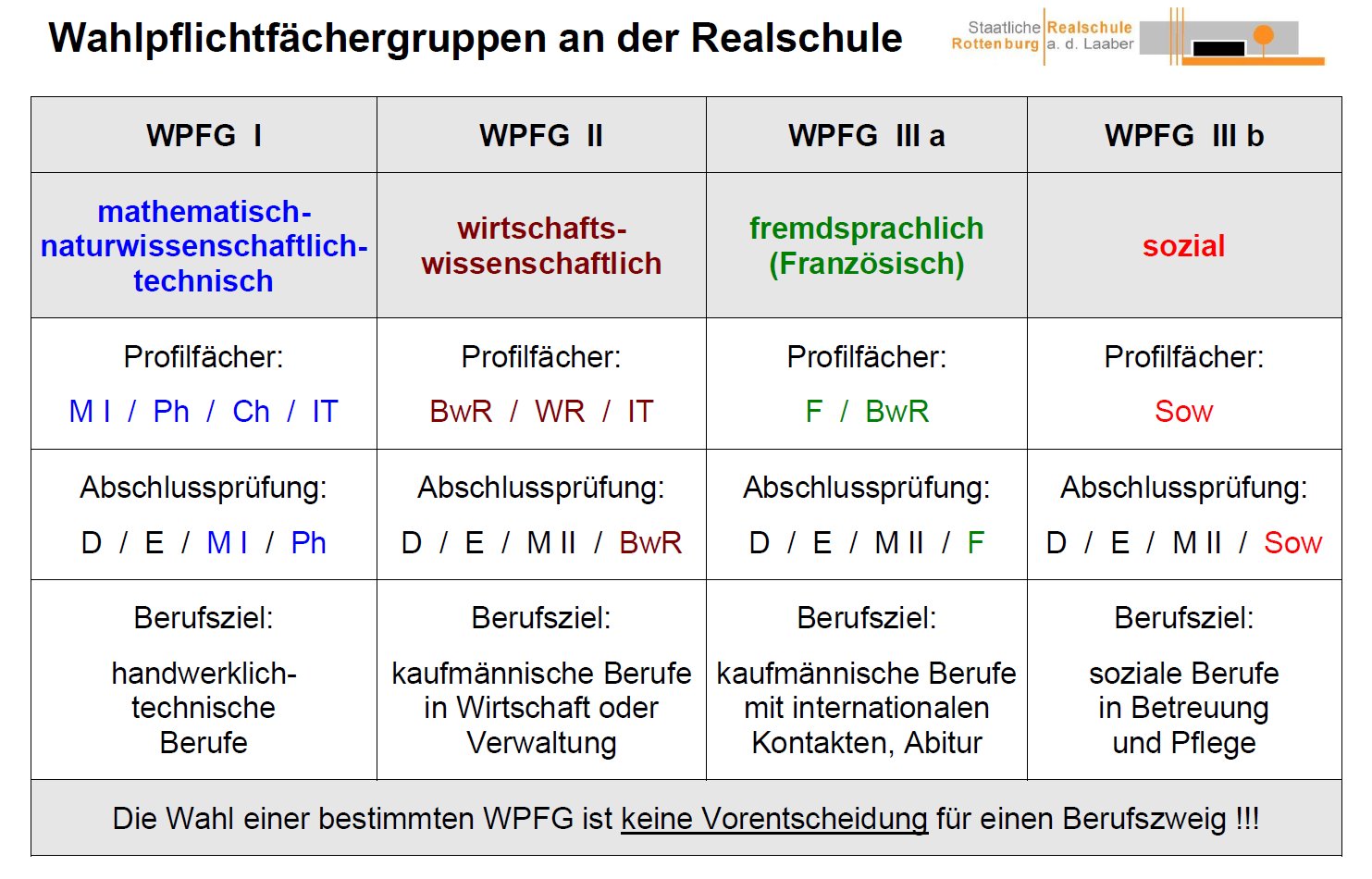 Es gibt drei Ausbildungsrichtungen, die sog. Wahlpflichtfächergruppen. Diese setzen ab der 7. Jahrgangsstufe verschiedene Bildungsschwerpunkte. Um die Schülerinnen und Schüler optimal auf das Berufsleben vorzubereiten, können sie zwischen drei Wahlpflichtfächergruppen wählen. Die Gruppe III teilt sich in IIIa und IIIb. Dabei kann die Gruppe IIIb nur zustande kommen, wenn auch die Gruppe IIIa existiert.