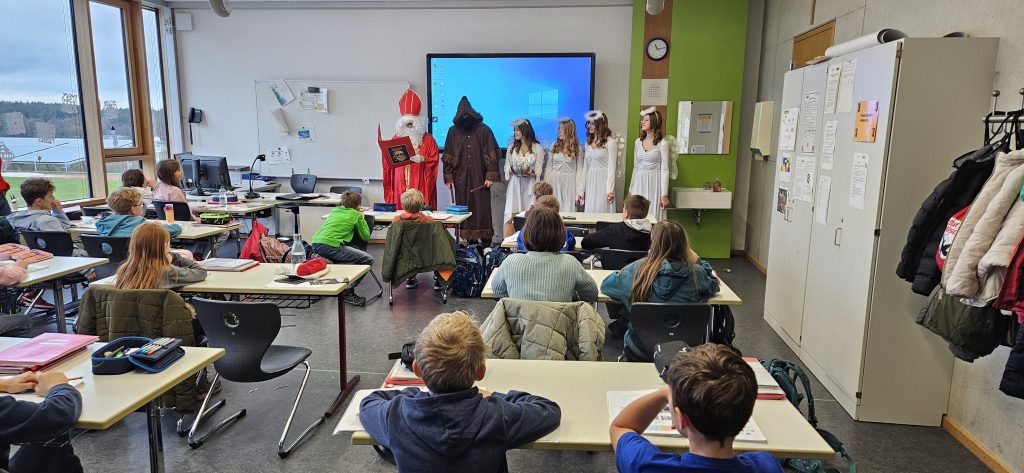In festlicher Stimmung betraten sie die einzelnen Klassenzimmer, begleitet von erwartungsvollen Blicken der Kinder. Der Nikolaus, in seinem traditionellen roten Mantel, begrüßte die Klassen herzlich. Unterstützt wurde er von vier Engeln, die mit ihren weißen Gewändern eine himmlische Atmosphäre verbreiteten. Auch der Krampus durfte nicht fehlen. Er sorgte für einen Hauch von Nervenkitzel, blieb jedoch meist freundlich und zurückhaltend.