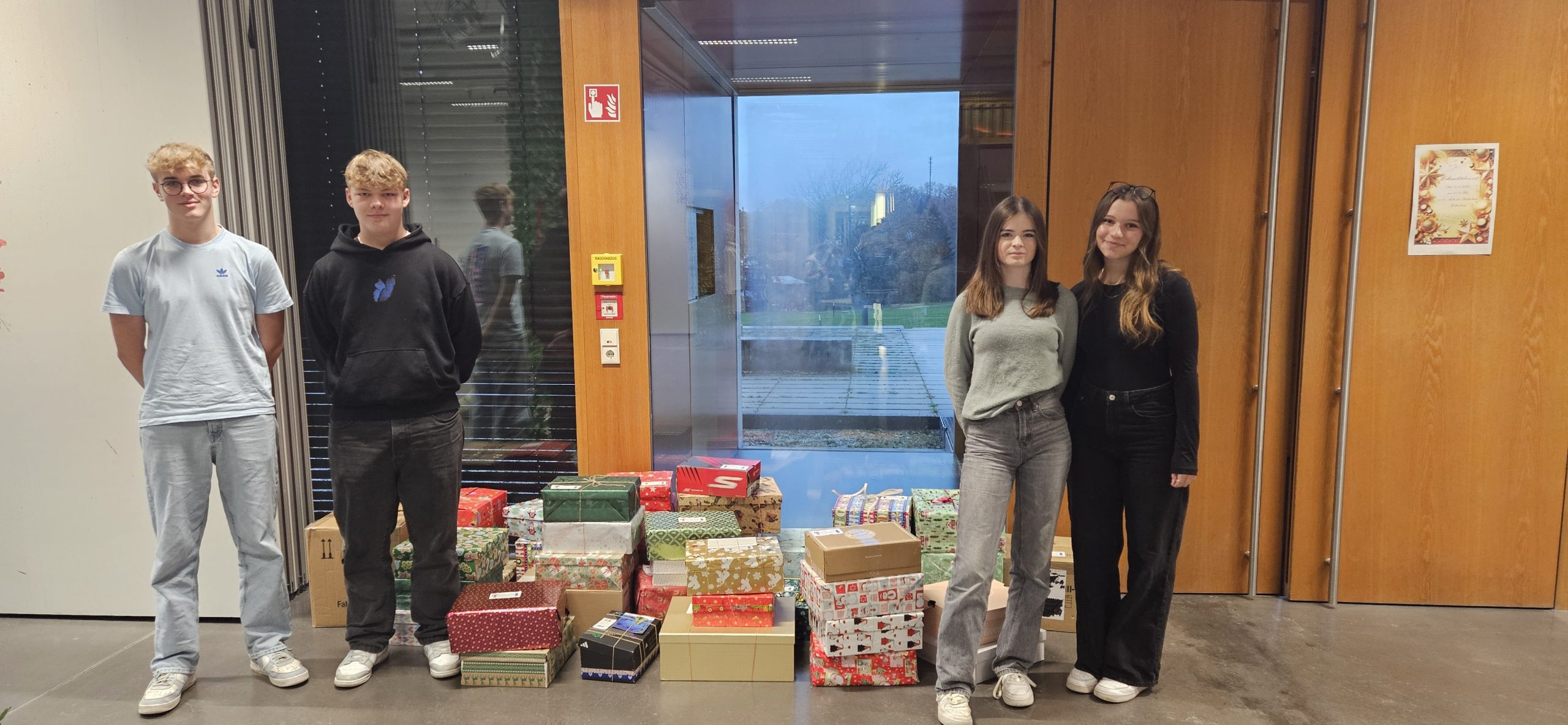 Auch in diesem Schuljahr organisierte die SMV erneut die Aktion „Geschenke mit Herz“, bei der jede Klasse zwei Päckchen für bedürftige Kinder packte. So kamen über 50 liebevoll verpackte Päckchen zusammen, die am 26. November an der Schule abgeholt wurden. In den Päckchen befanden sich neben Hygieneartikeln, Schulmaterialien und warmer Kleidung auch Spielzeug und Süßigkeiten.