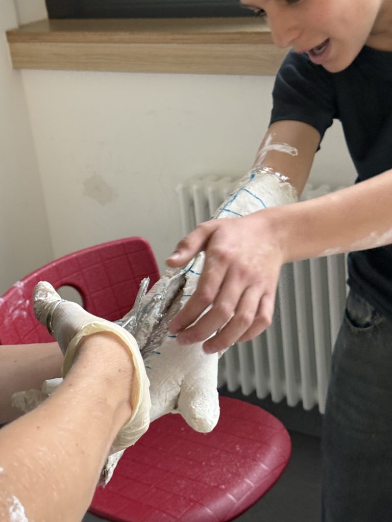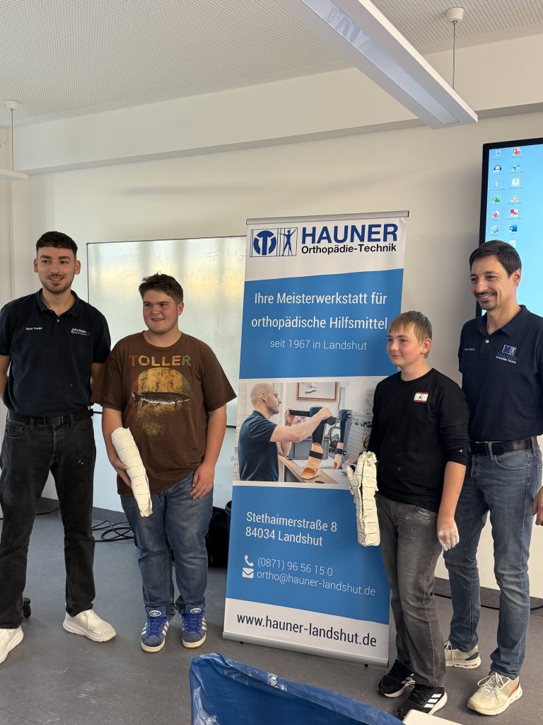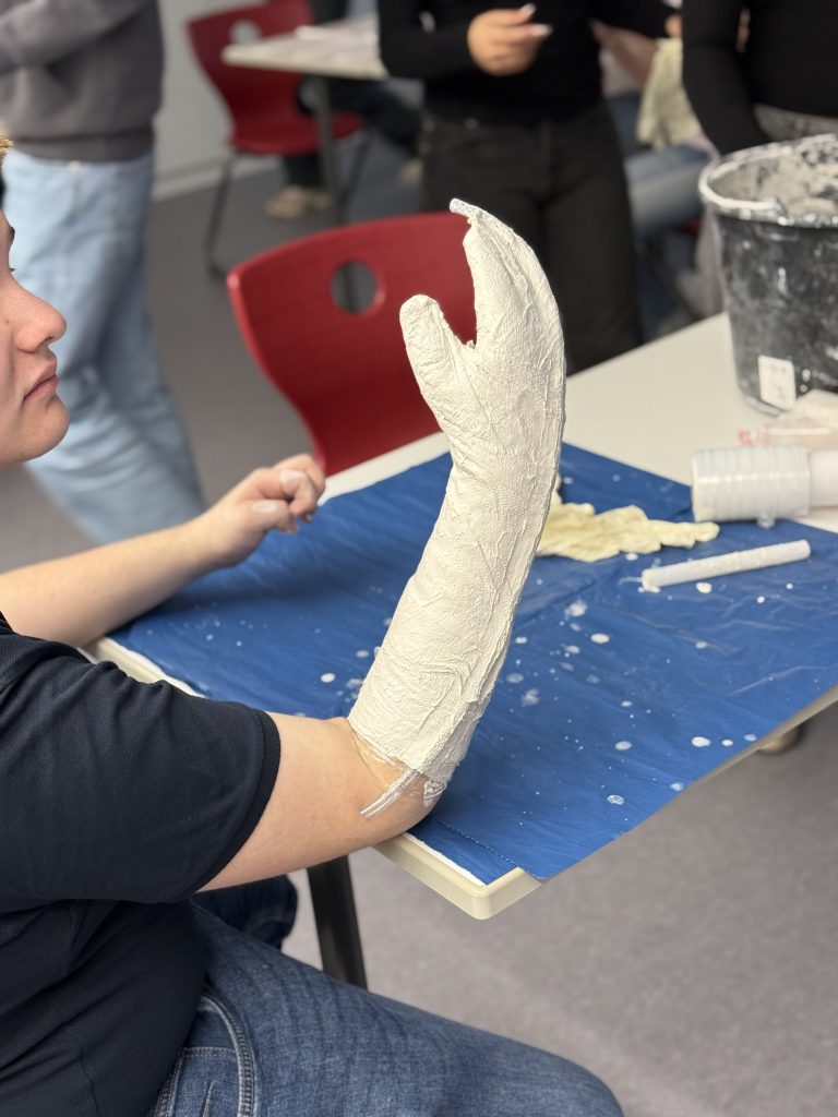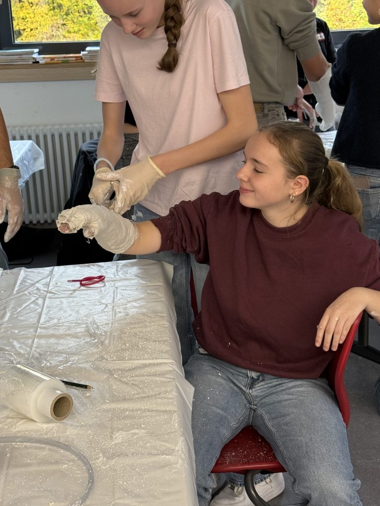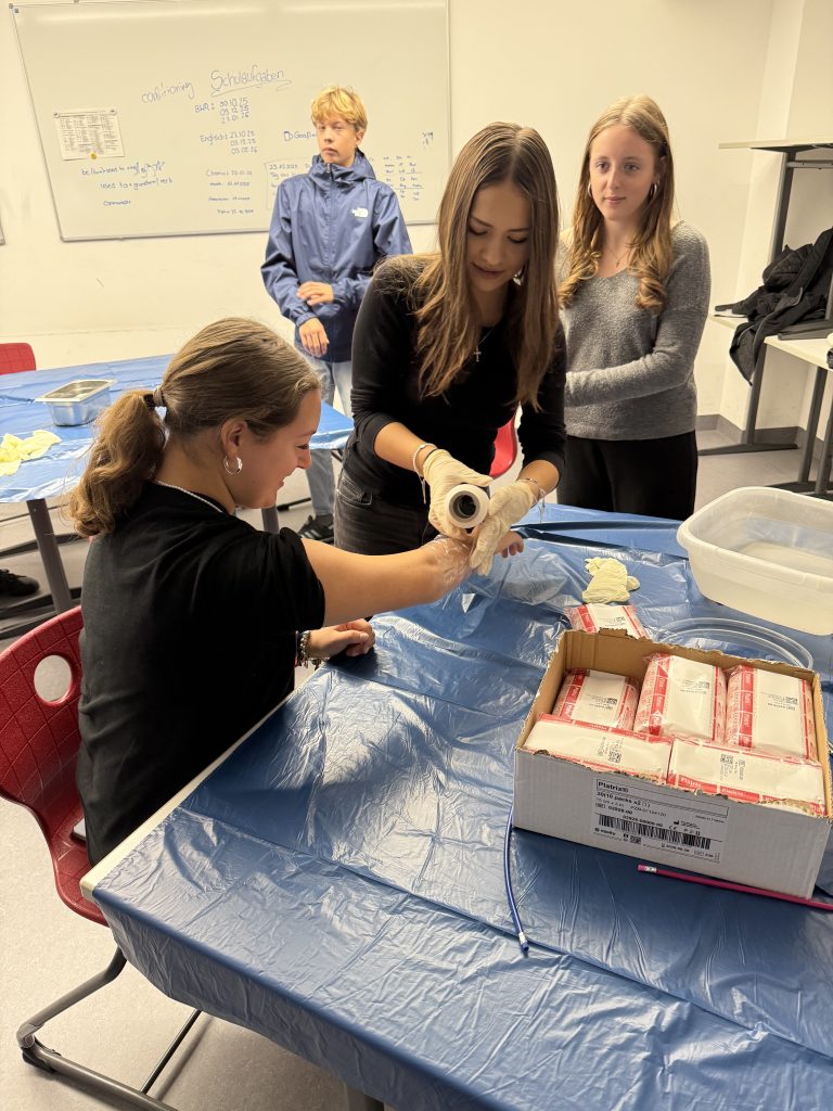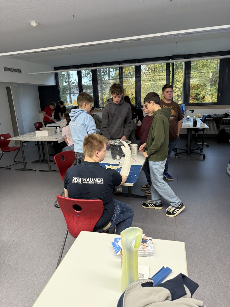 Ein weiterer für viele unbekannter Beruf präsentierte sich in diesem Jahr bei uns: Orthopädietechniker/in. Die Schülerinnen und Schüler durften sich gegenseitig einen Arm eingipsen, die Gipsverbände wieder aufschneiden und diese als Vorstufe zu einer Prothese betrachten.