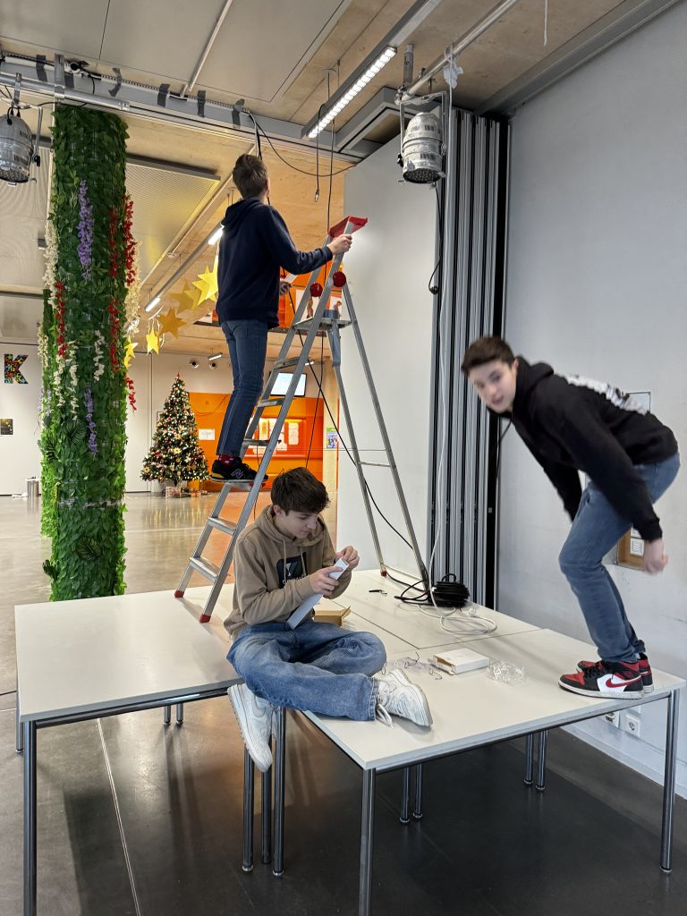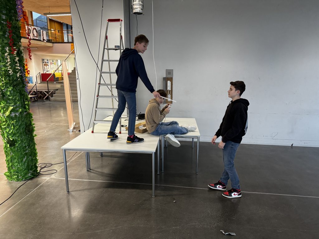 Eine der wichtigsten Aufgaben war die unauffällige Installation der Kabel für die an der Decke angebrachten Lichter und Lautsprecher. Luca, Tim, Tobias B., Lukas und Tobias C. waren die geschickten Hände, die diese anspruchsvolle Aufgabe meisterten. Durch die Befestigung in Kabelkanälen an der Decke wird das Publikum im Zuschauerraum von den technischen Vorbereitungen nichts bemerken und sich ganz auf die beeindruckende Inszenierung konzentrieren können.