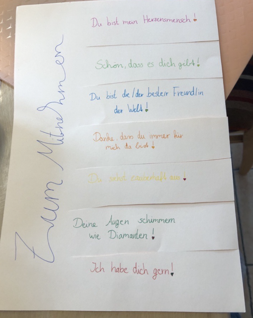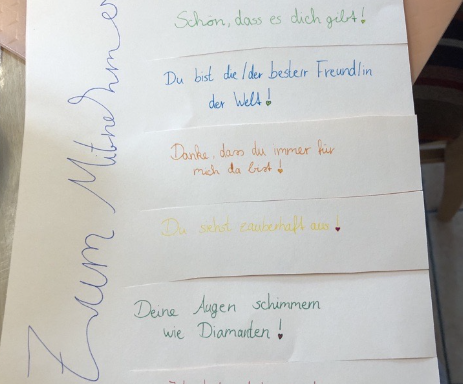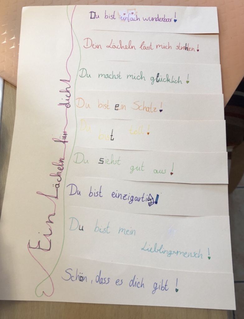 Bereits am Vortag wurde das Schulhaus mit zahlreichen bunten Zetteln geschmückt, die „Komplimente to go“ enthielten. Diese Zettel waren mit liebenswerten und ermutigenden Botschaften wie „Du bist großartig!“, „Danke für deine Hilfe!“ oder „Du bringst immer gute Laune!“ bedruckt. Die Idee war einfach: Jeder, der einen Zettel sah, konnte sich ein Kompliment nehmen und es an einen Lehrer, Mitschüler oder das Personal der Schule weitergeben.