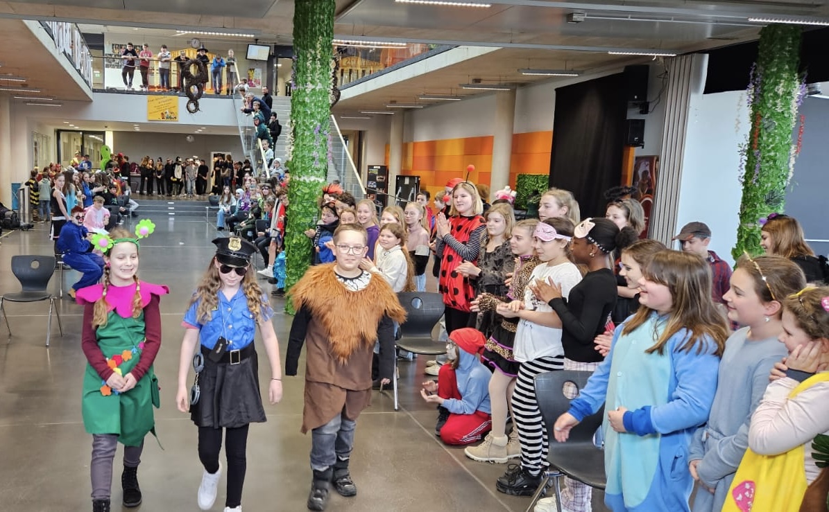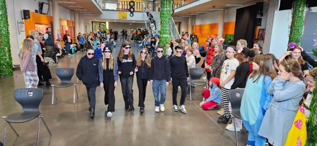 In einer Vollversammlung der gesamten Unterstufe samt ihren Lehrern stellten die Klassensieger bei einem Catwalk zu fetziger Musik ihre Kostüme zur Schau.